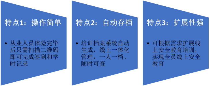 通过安全文化感知、理论知识培训、安全游戏学习、防护用品认知、安全标志学习等多种安全培训学习,提升学员的安全知识。通过“多媒体安全培训+无纸化考试+VR体验式教学”的培训模式,为从业人员提供科学、系统、专业的教学培训方案,增加培训乐趣、提升培训效果。