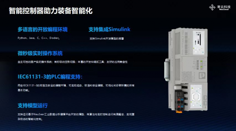 NeuSeer智能控制器,针对传统控制器存在着不具备物联的能力、无法支撑复杂的智能算法、算法模型无法与实时控制紧密结合以及与外部的集成能力有限等局限性,提供微秒级切换延迟的实时操作系统,兼容IEC61131-3的PLC编程语言,支持多种工业协议的实时采集;提供开放的多语言代码编程和运行环境,并支持运行基于NeuSeer数据分析建模平台开发的模型,将算法与实时控制进行完美整合,以实现复杂动态的智能化控制。