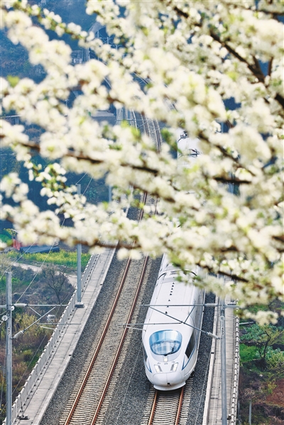 列车疾驰而过,花瓣映衬下,春的气息扑面而来。王飞 摄