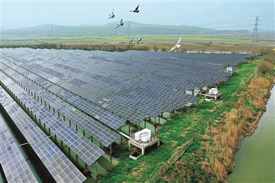 在泛绿的田野里,光伏电站上方有飞鸟飞过,一副生态和谐之景。张荣宸 摄