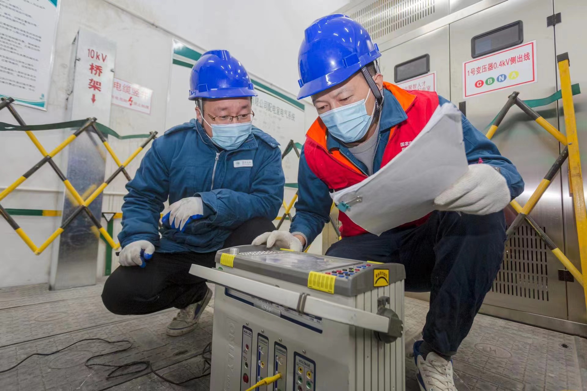 4月7日,国网山东枣庄供电公司党员服务队队员在聚智人才配电室进行开关柜试验调试工作,全力保障客户用电需求。李立 曹欣 摄影报道