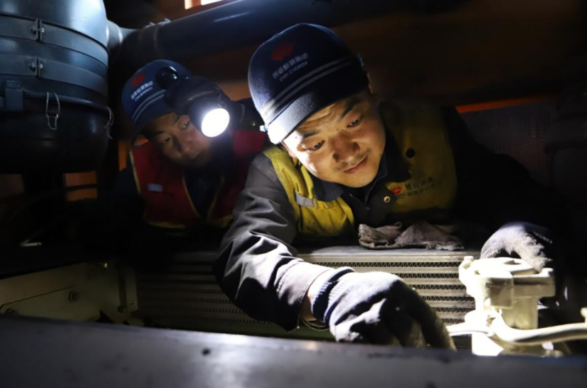 4月9日,党员在连夜抢修QS—650型清筛机发动机。面对突发故障,党员先锋队经过8小时昼夜抢修和多次设备调试工作,顺利完成设备抢修,清筛车发动机各项技术性能恢复规定要求。(李启孟 摄)