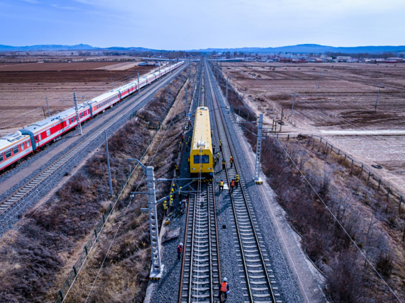 4月30日,准格尔段大准线换轨作业。当天,随着区间开通调度命令的下达,为期30天的2024年大准线春季集中修轨道维护作业圆满收官。此次集中修累计完成线路清筛55.887公里,道岔清筛68.5组,线路捣固332.67公里,道岔捣固310组,更换钢轨51.504公里,焊接接头370头,应力放散61.769公里,更换曲磨轨7.631公里,桥梁清筛3.23公里,换轨复捣53.7公里,精测精捣40公里,更换水沟盖板5398块、更换挡砟板2980块。(石玉磊 摄)