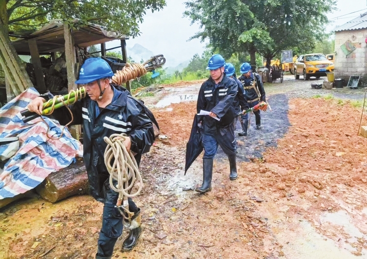 5月19日,广西电网公司桂林兴安供电局工作人员前往线路故障点进行抢修。周海摄