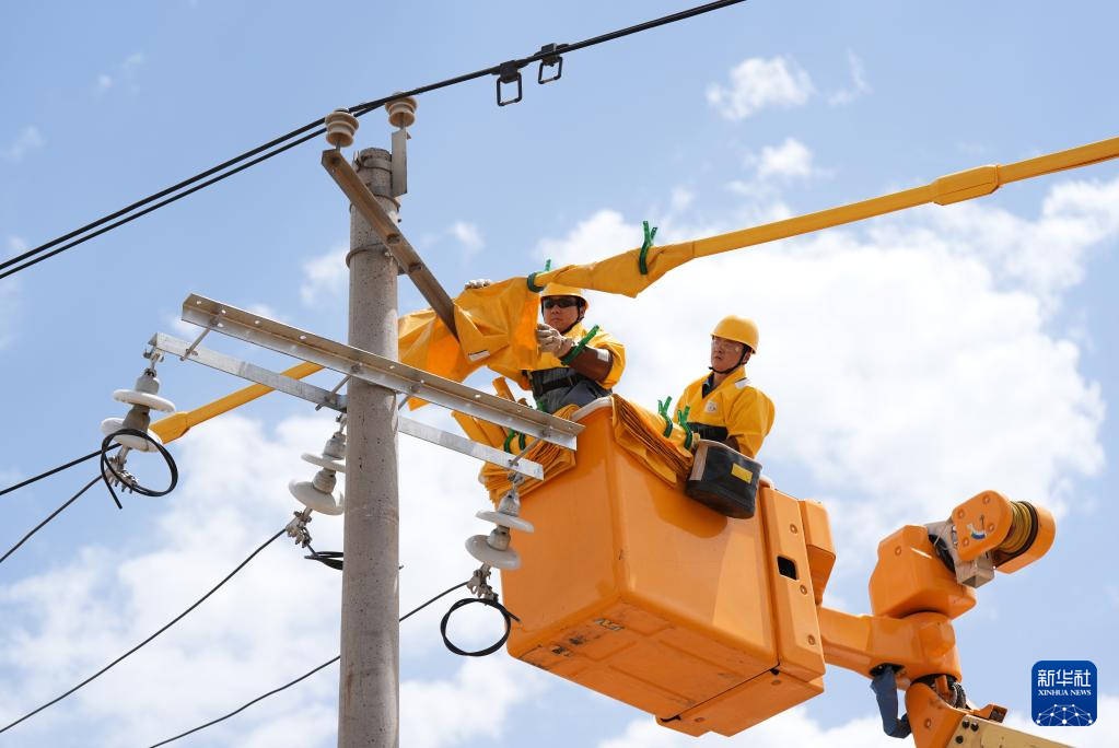 近日,宁夏银川迎来高温天气,电网负荷随之不断攀升。国网银川供电公司带电作业中心员工冒着高温,进行带电作业,保障夏季用电高峰期电网安全稳定运行。 (王鹏 摄)