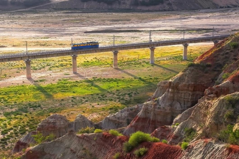 夕阳下,火车在金光中前行,远处的沙丘与近处丹霞似彩绘,色彩交织热烈奔放。(梁逾华摄)