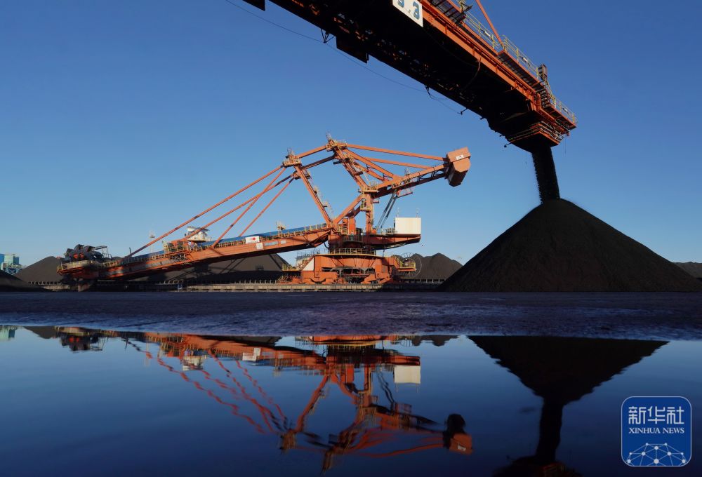 12月16日,唐山港曹妃甸港区煤炭码头堆场的堆料设备在工作中。