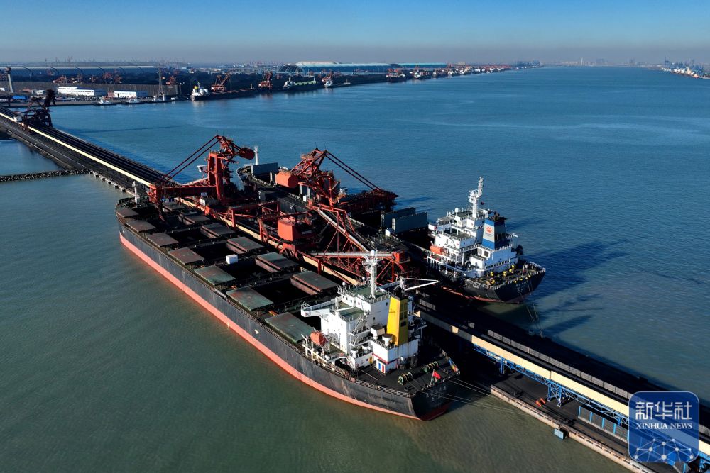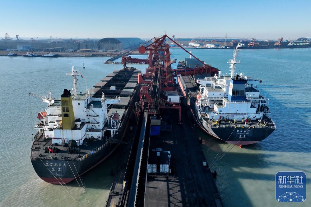 12月16日,轮船靠泊在唐山港曹妃甸港区煤炭码头装货(无人机照片)。