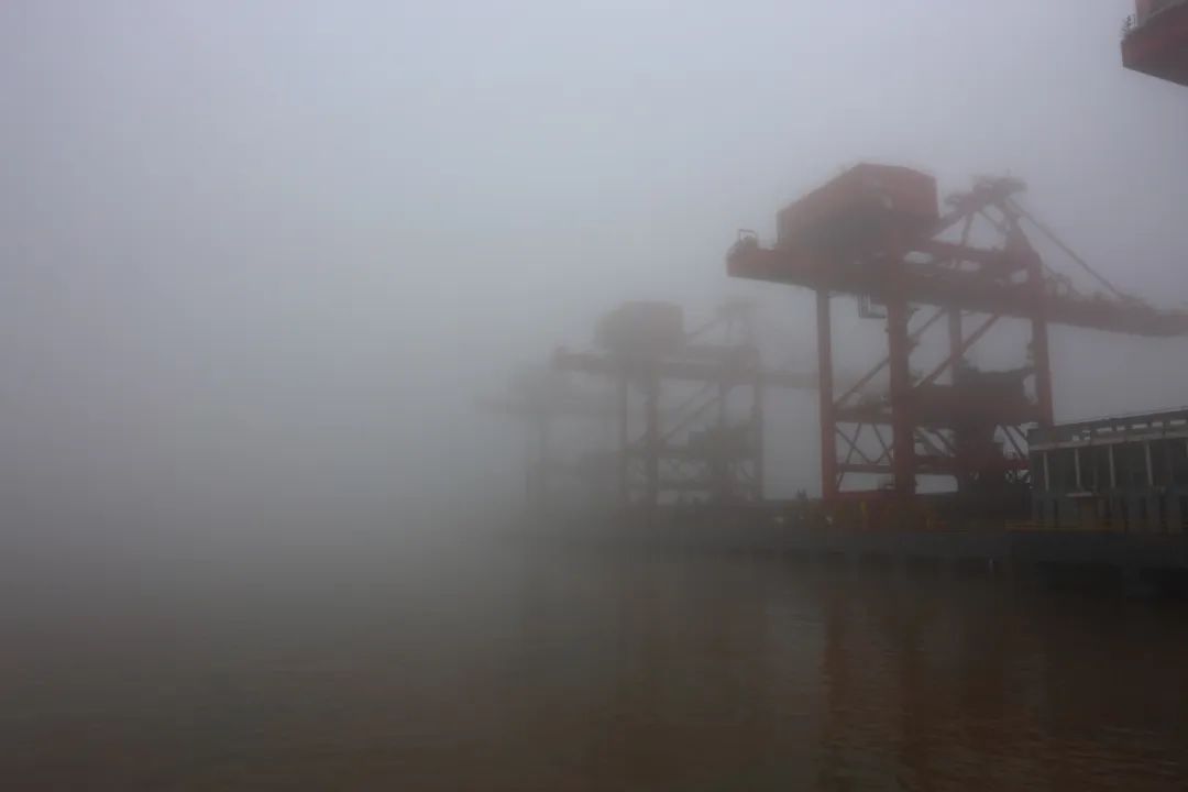 浙能港口港区大雾弥漫,如同一块巨大的幕布。