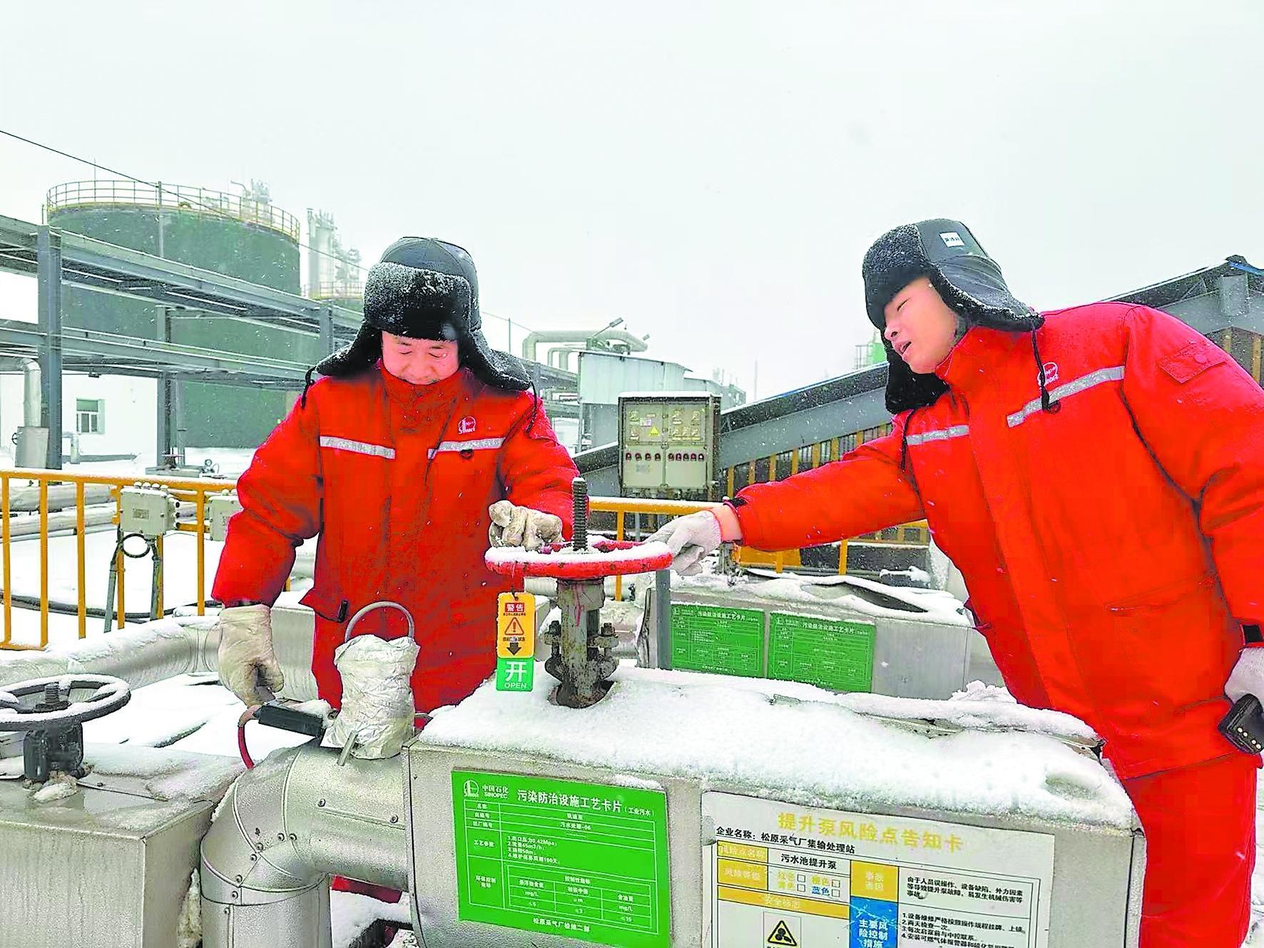 东北油气员工坚守岗位,增加巡检频次,全面排查隐患,确保设备设施安全运行,保障冬季天然气生产供应。图为1月11日东北油气田松原采气厂巡检班员工冒雪检查设备运行情况。路达摄