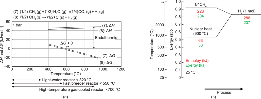 因此,利用核热能将甲烷转化为氢气的过程可以理解为:如果不提供核能,将需要1.28倍的甲烷量(包括提供反应热量的燃料);原则上,使用核能可以节省这一数量的甲烷。通过在使用甲烷的吸热反应中加入具有约0.5㶲效比(900 ℃)的核热能,就像放入热泵一样将低质量的热能抽到具有高㶲效比的氢气水平,从而提高了该能源的质量。在这种转换中,由于原则上不产生废热,因此核热能可以得到有效利用。