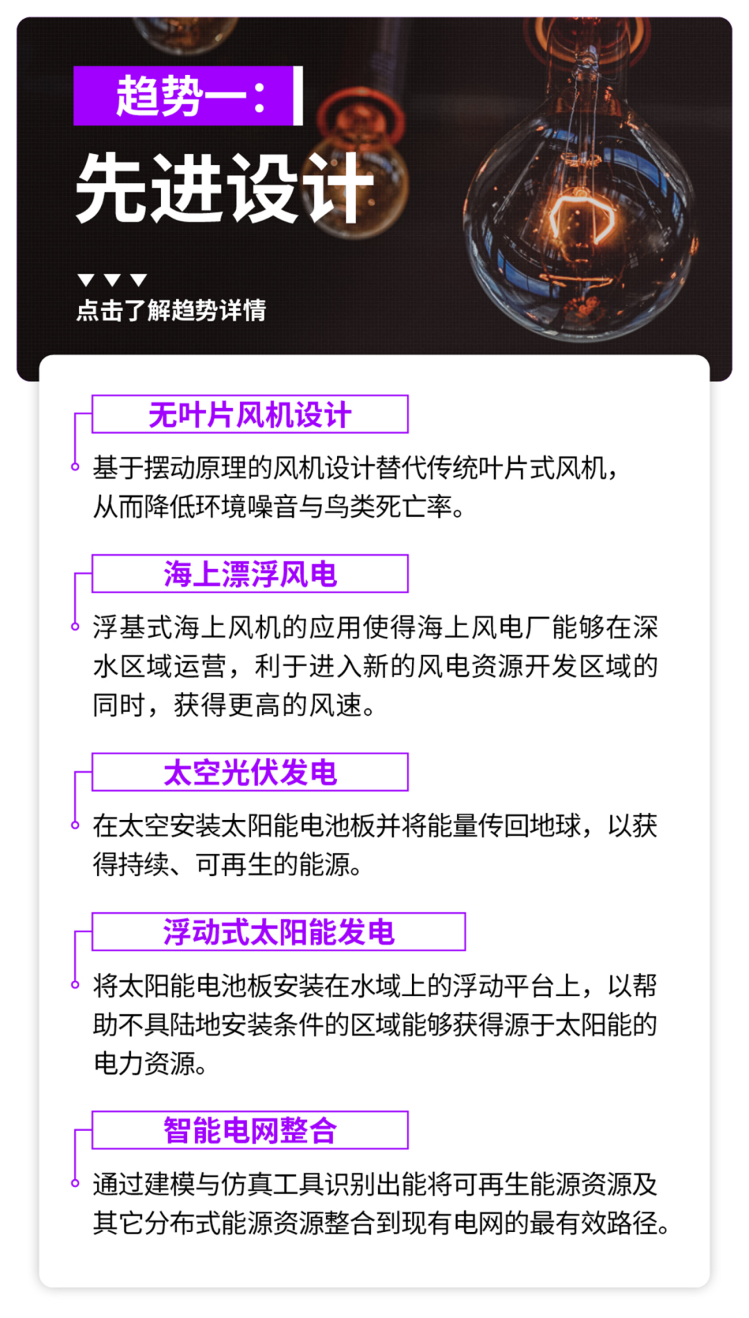 建立新的融资机制以加速能源转型(如建立新的可持续投资基金等),进而更多探索对于先进设计与储能等技术(如无叶片风机、水上漂浮式风电与太阳能发电等)的投资,在孵化能源转型创新关键技术的同时,为投资者获得更高的回报。