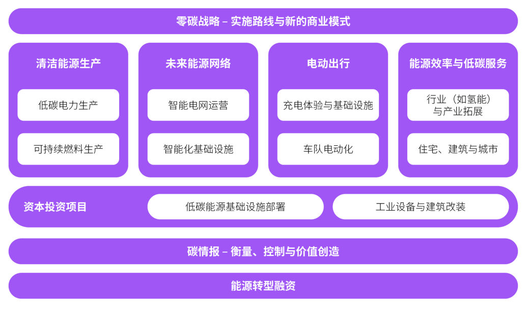 制定符合行业特点的、清晰的能源转型战略,和以零碳为核心的价值实现路线图,识别支持能源转型的新业务增长领域(如设计与开发新的产品以确保可再生能源相关设备设施符合气候风险模型要求),以达到低碳、高回报的未来发展愿景。同时,企业还需要围绕价值创造目标及转型战略与实施路径,构建客制化的配套运营模式,以最经济、高效的方式实现目标。