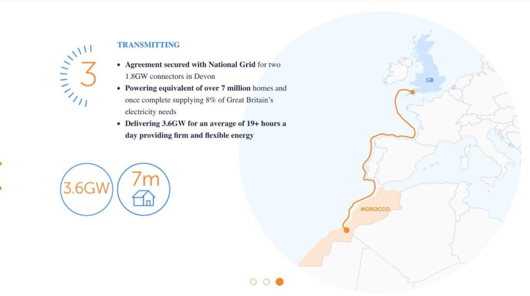 2021年对外公布的摩洛哥—英国电力项目是Xlinks公司的旗舰项目。根据项目规划,Xlinks将在摩洛哥西南部的坦坦省建造一个总面积1500平方英里的太阳能和风能发电基地,并通过长达4000公里的高压直流海底电缆,将摩洛哥的新能源电力送至英国。