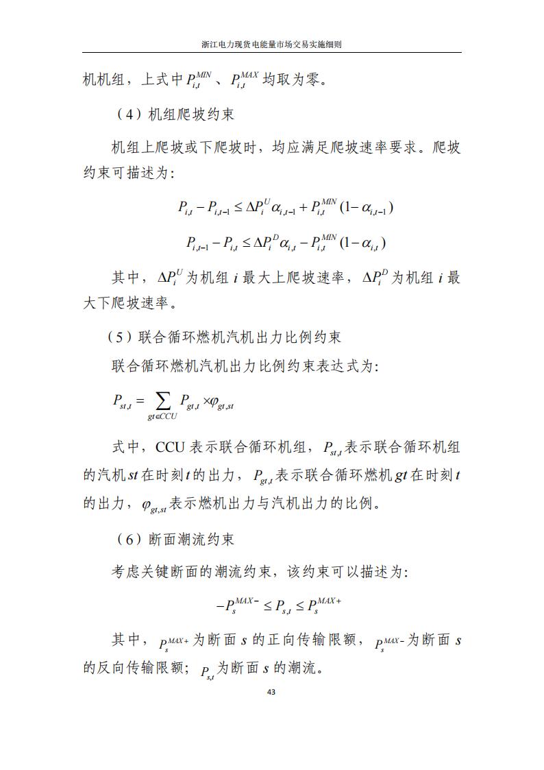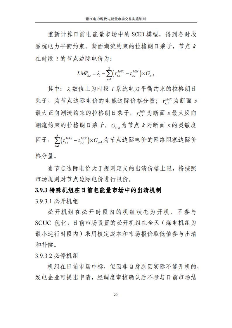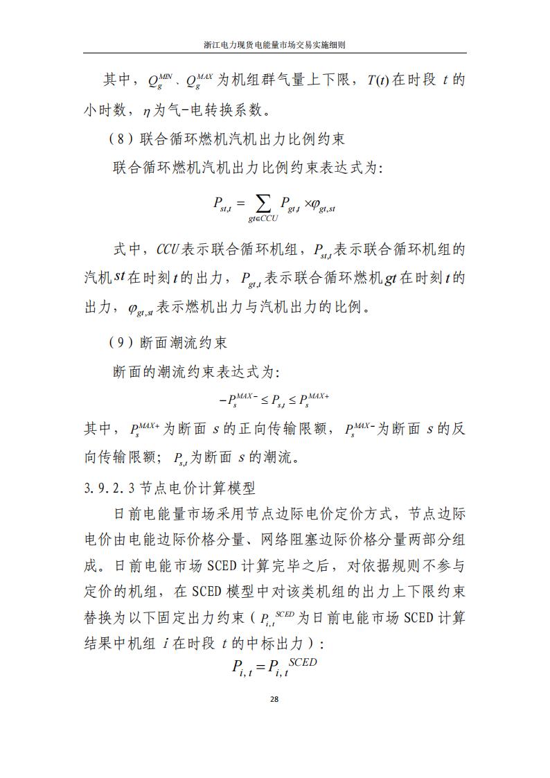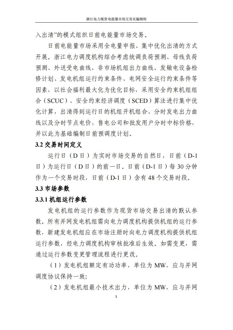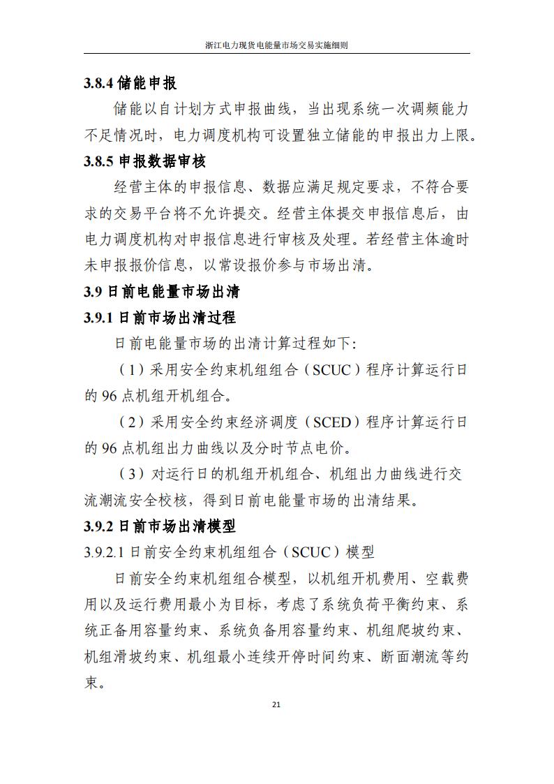 现阶段采取“发电侧报量报价、用户侧报量不报价且不纳入出清”的模式组织日前电能量市场交易。日前电能量市场采用全电量申报、集中优化出清的方式开展。浙江电力调度机构综合考虑统调负荷预测、母线负荷预测、外送受电曲线、非市场机组出力曲线、发输电设备检修计划、发电机组运行约束条件、电网安全运行约束条件等因素,以社会福利最大化为优化目标,采用安全约束机组组合(SCUC)、安全约束经济调度(SCED)算法进行集中优化计算,出清得到运行日的机组开机组合、分时发电出力曲线以及分时节点电价,售电公司和批发用户分时中标价格,并以此为基础编制日前预调度计划。