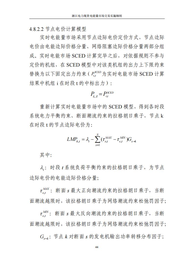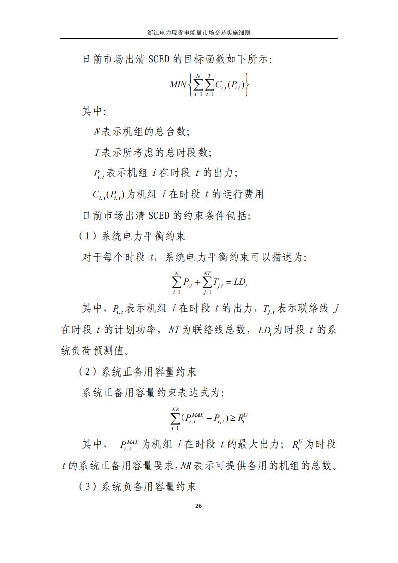 实时市场中,电力调度机构基于最新的电网运行状态、超短期负荷预测与超短期新能源出力预测信息,综合考虑发电机组运行约束条件、电网安全运行约束条件、日内机组启停、日内省间现货交易、日内华东区域辅助服务市场交易等因素,在日前市场与日前调度计划调整确定的开机组合基础上,以发电成本最小为优化目标,采用安全约束经济调度(SCED)算法进行优化计算,滚动优化机组出力,形成各市场机组需要实际执行的发电计划和实时节点电价,确保系统平衡、实施阻塞管理。