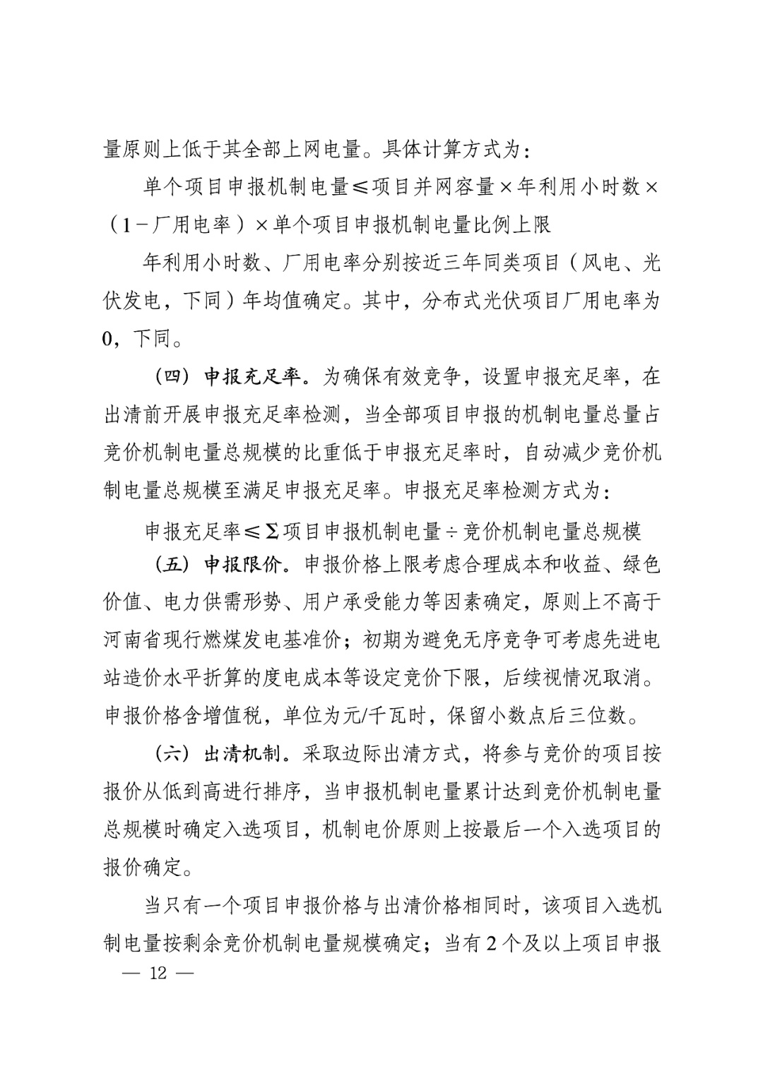 机制电价:申报价格上限考虑合理成本和收益、绿色价值、电力供需形势、用户承受能力等因素确定,原则上不高于河南省现行燃煤发电基准价;初期为避免无序竞争可考虑先进电站造价水平折算的度电成本等设定竞价下限,后续视情况取消。