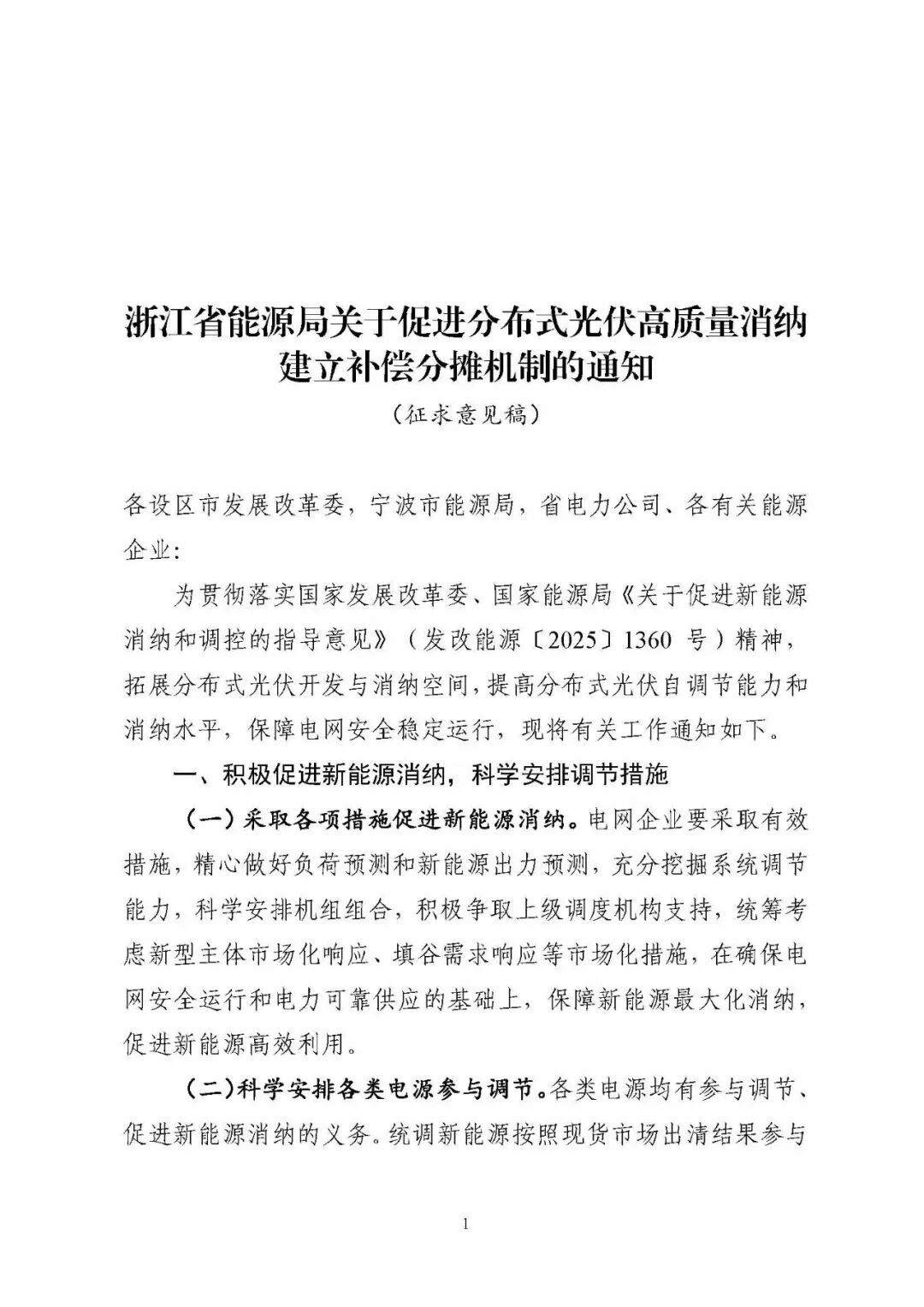 1月7日,浙江省发改委发布《浙江省能源局关于促进分布式光伏高质量消纳建立补偿分摊机制的通知(征求意见稿)》。文件指出,拓展分布式光伏开发与消纳空间,提高分布式光伏自调节能力和消纳水平,保障电网安全稳定运行。