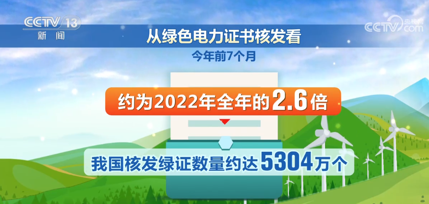 从绿色电力证书核发看,今年前7个月,我国核发绿证数量约达5304万个,约为2022年全年的2.6倍,截至7月底,全国共累计核发绿证超过1.2亿个。