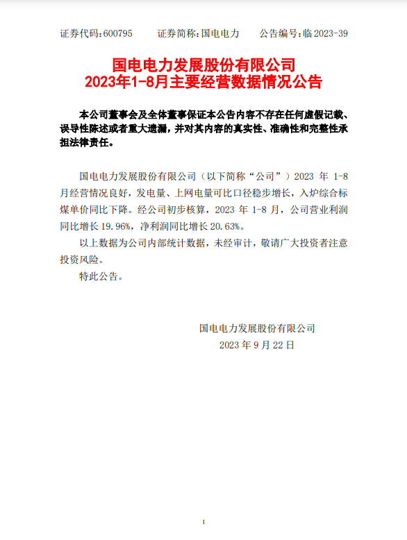 上海证券交易所官网显示,9月22日,国电电力发布2023年1-8月主要经营数据情况公告。