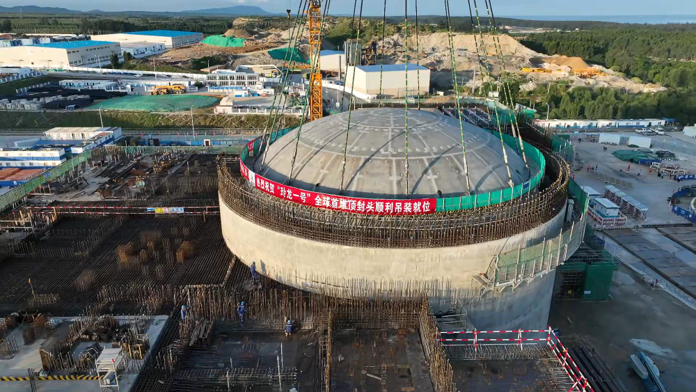 11月3日,在海南昌江核电站,多用途模块式小型堆科技示范工程“玲龙一号”钢制安全壳顶封头顺利吊装就位。海南核电有限公司供图