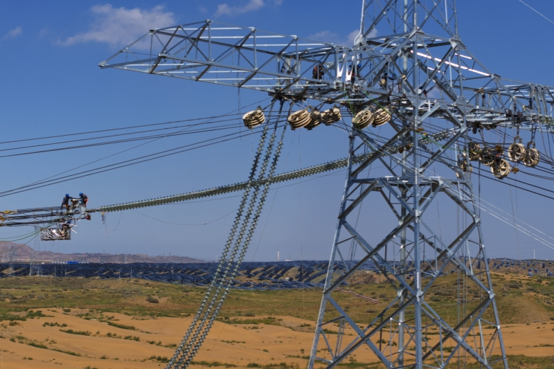 国网宁夏电力施工人员在±800千伏“宁电入湘”工程线路安装附件。