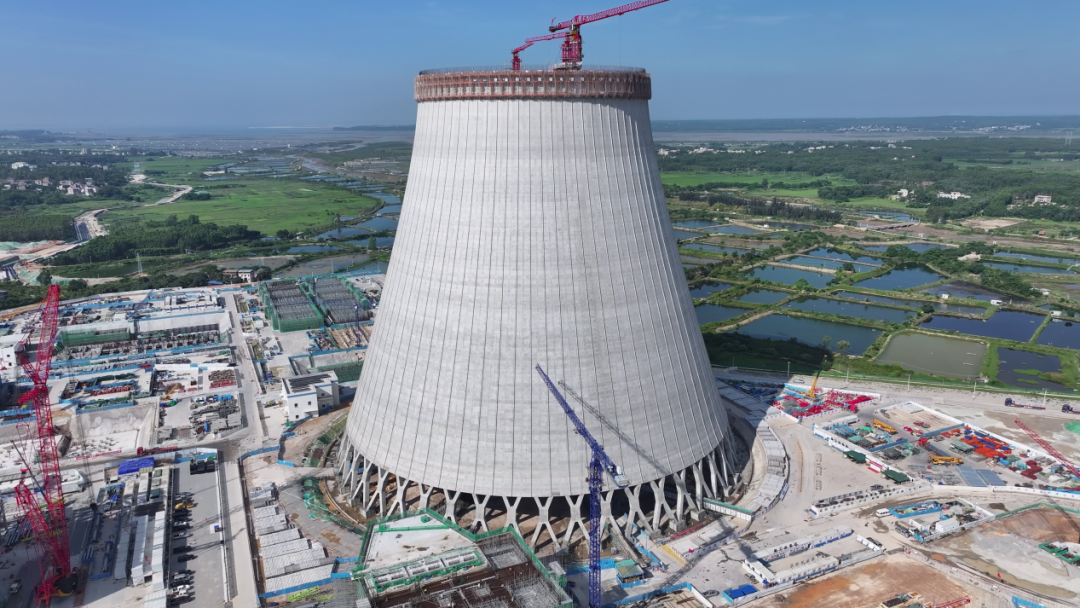 ▲廉江核电项目1号机组冷却塔筒壁最大直径约166米,最小直径约90米。图为廉江核电项目1号机组冷却塔筒壁第100节混凝土浇筑完成。