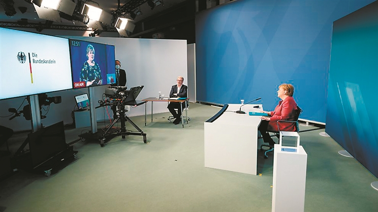 德国总理默克尔与挪威首相索尔贝格通过视频连线,宣布NordLink工程正式开通。 来源:德国联邦政府网