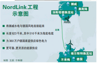 据了解,NordLink互联工程是德国和挪威之间第一条直流输电系统,从挪威的汤斯塔德到德国的维尔斯特,全长623千米,输电系统采用高压直流技术,最大容量1400兆瓦。