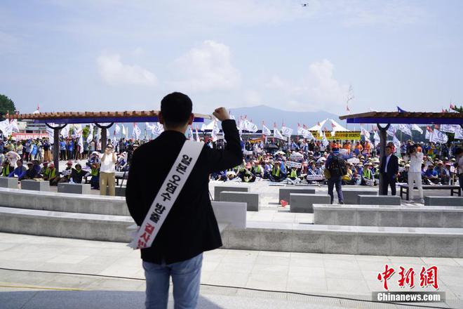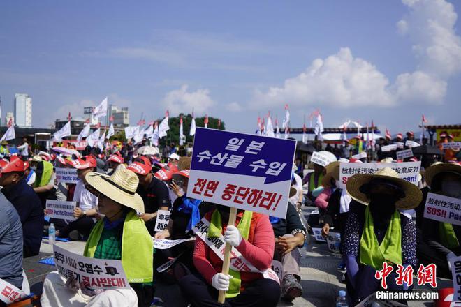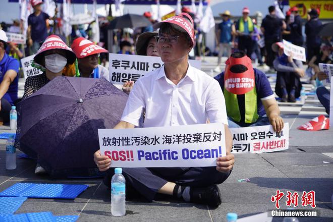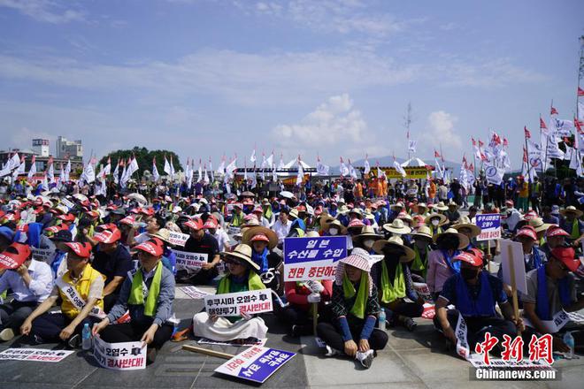 8月16日,韩国全国渔民会总联盟的渔民在全罗南道高兴郡沿海一带举行集会,抗议日本核污染水排海。图为抗议活动现场。
