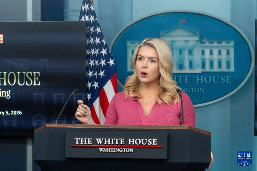 2月5日,在美国首都华盛顿白宫,白宫新闻秘书莱维特出席记者会。新华社发(李源清摄)
