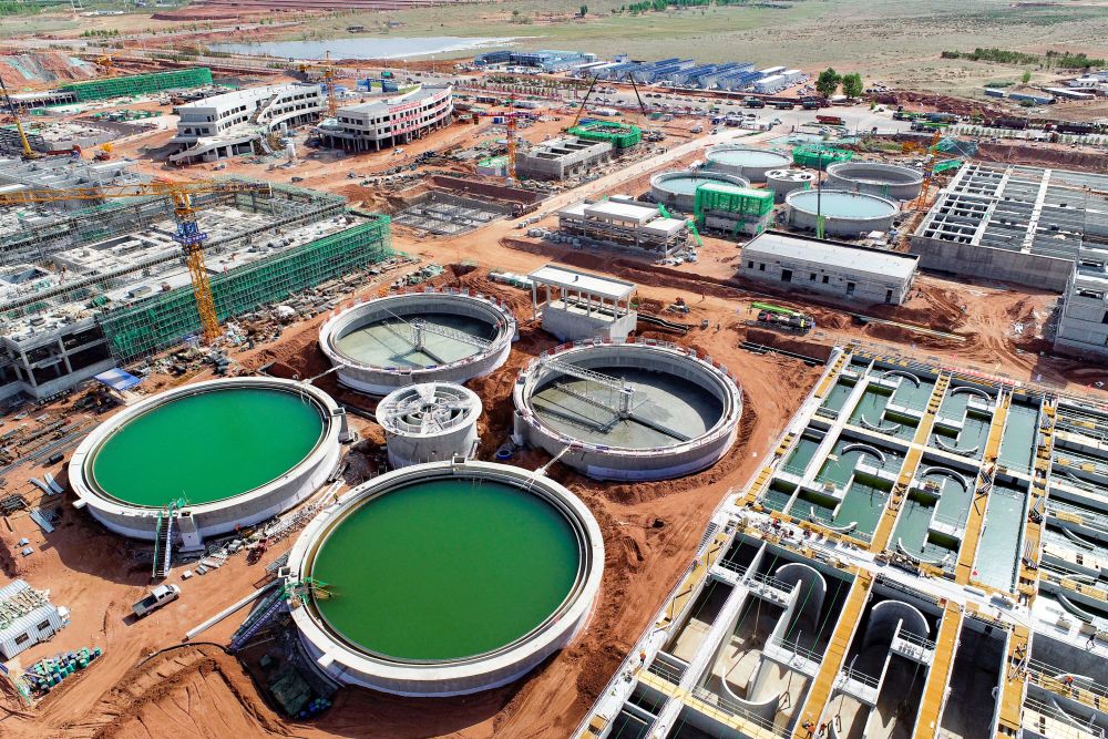 5月13日在鄂尔多斯拍摄的零碳产业园工业污水处理厂及水资源再生利用项目施工现场(无人机照片)。新华社发(王正摄)