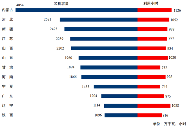 图3 1-5月份风电装机较多省份风电装机容量和设备利用小时