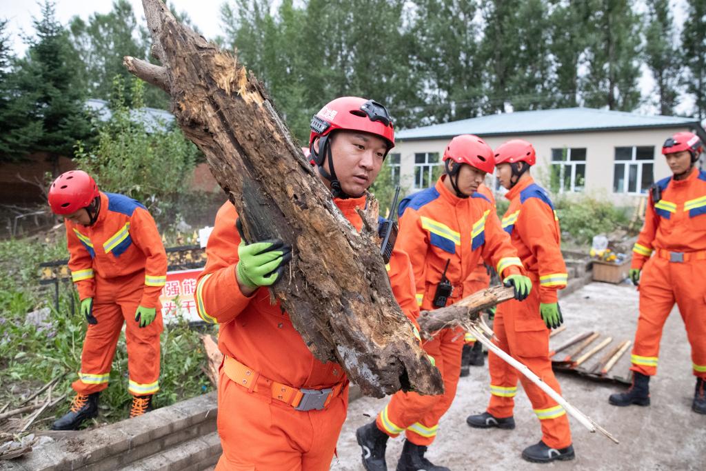 8月6日,在海林市长汀镇内,消防救援人员在清理院舍。新华社记者张涛摄