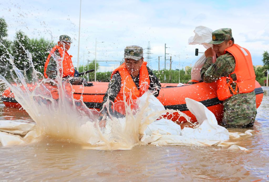 8月5日,黑龙江省哈尔滨市道外区人武部民兵应急分队在团结镇勤劳村展开救援。新华社发(吕衍海摄)