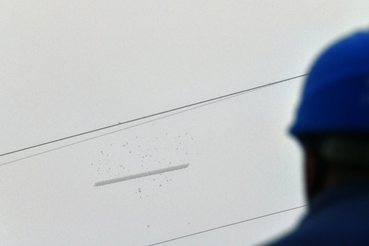 12月16日,南方电网贵州毕节供电局对220千伏乌威线开展直流融冰工作,这是贵州电网入冬以来首次融冰作业。图为在毕节市威宁县盐仓镇线路杆塔处,直流融冰装置启动后,随着电流升高,导线发热,线路覆冰纷纷掉落。(罗凯 摄)