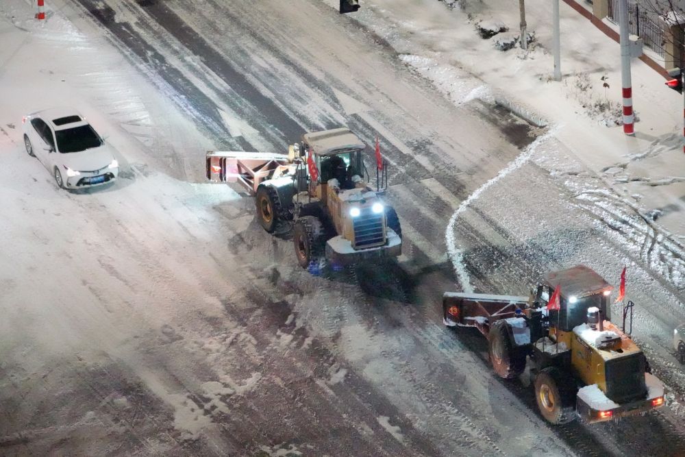 12月16日,大型机械在山东省烟台市高新区街头清理道路积雪。新华社发(唐克摄)