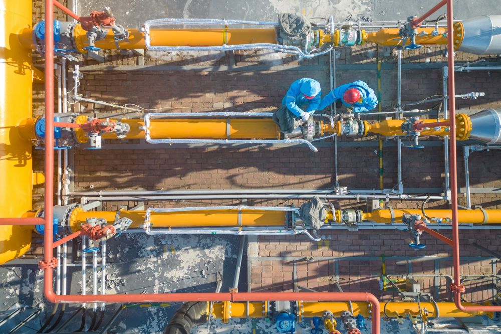 12月17日,黑龙江省哈尔滨市中庆燃气有限责任公司成高子门站的工作人员在进行设备巡检,保障燃气供应(无人机照片)。新华社记者张涛摄