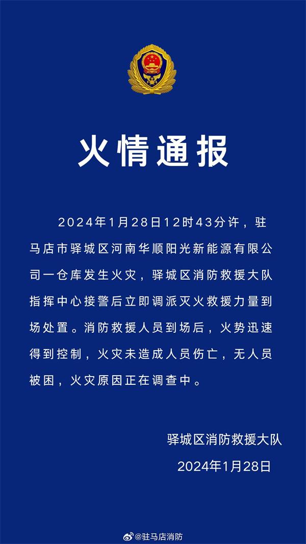2024年1月28日12时43分许,驻马店市驿城区河南华顺阳光新能源有限公司一仓库发生火灾,驿城区消防救援大队指挥中心接警后,立即调派灭火救援力量到场处置。火势迅速得到控制,火灾未造成人员伤亡,无人员被困,火灾原因正在调查中。(彭华)