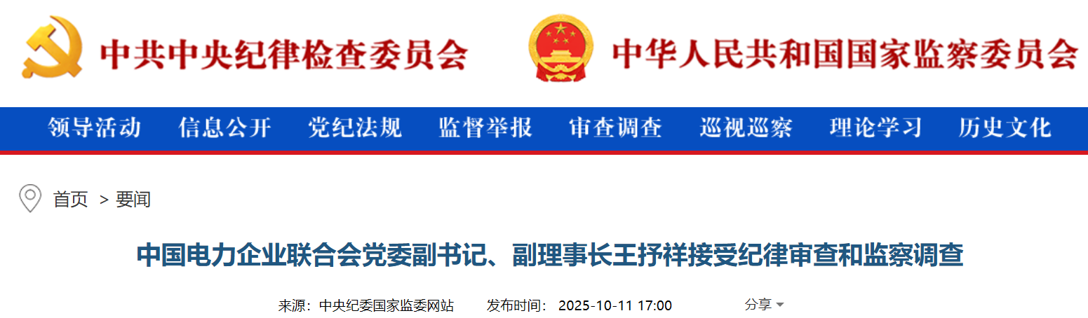 据中央纪委国家监委驻中央社会工作部纪检监察组、黑龙江省纪委监委消息:中国电力企业联合会党委副书记、副理事长王抒祥涉嫌严重违纪违法,目前正接受中央纪委国家监委驻中央社会工作部纪检监察组纪律审查和黑龙江省牡丹江市监察委员会监察调查。