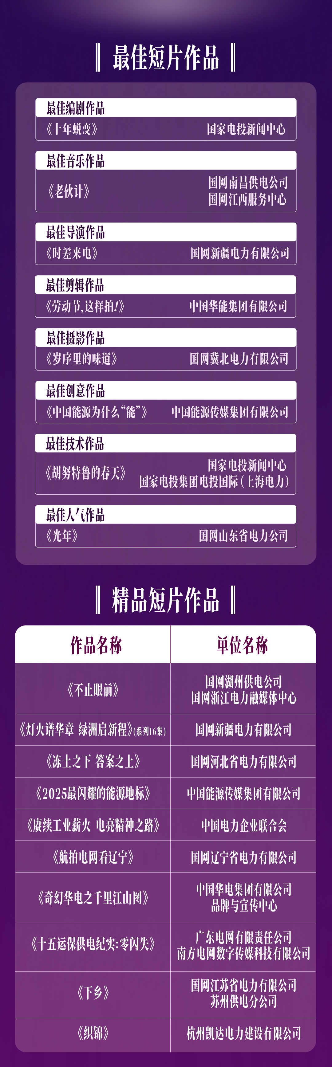 本次活动得到来自全国能源电力行业百余家单位的积极响应,共征集到涵盖电力、油气、煤炭、新能源等能源行业各领域的优秀短片作品1300余部。活动秉持公开、公平、公正原则,邀请国内影视领域具有成就的专家学者出任评委。最终从征集作品中推荐出最佳人气作品1部(由“能源中国”客户端用户推荐产生)、最佳创意作品1部、最佳编剧作品1部、最佳剪辑作品1部、最佳音乐作品1部、最佳摄影作品1部、最佳导演作品1部、最佳技术作品1部,精品短片作品10部、优秀短片作品22部、入围短片作品60部。