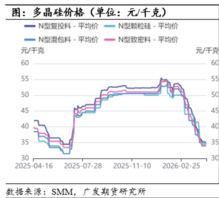 中国有色金属工业协会硅业分会于4月15日的报价显示,多晶硅N型复投料成交价格区间为3.4万-3.6万元/吨,成交均价为3.53万元/吨,环比下滑1.94%;N型颗粒硅成交价格区间为3.4万-3.5万元/吨,成交均价为3.43万元/吨,环比下滑2%。