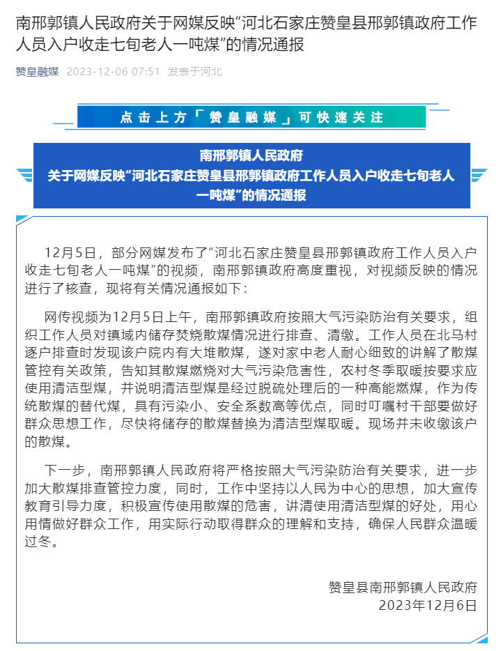 据“赞皇融媒”公众号消息,12月5日,部分网媒发布了“河北石家庄赞皇县邢郭镇政府工作人员入户收走七旬老人一吨煤”的视频,南邢郭镇政府高度重视,对视频反映的情况进行了核查,现将有关情况通报如下: