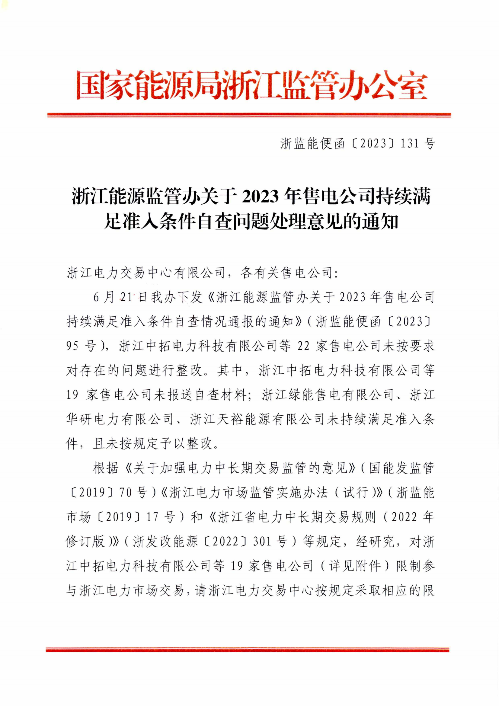 点击下载:浙江能源监管办关于2023年售电公司持续满足准入条件自查问题处理意见的通知.pdf