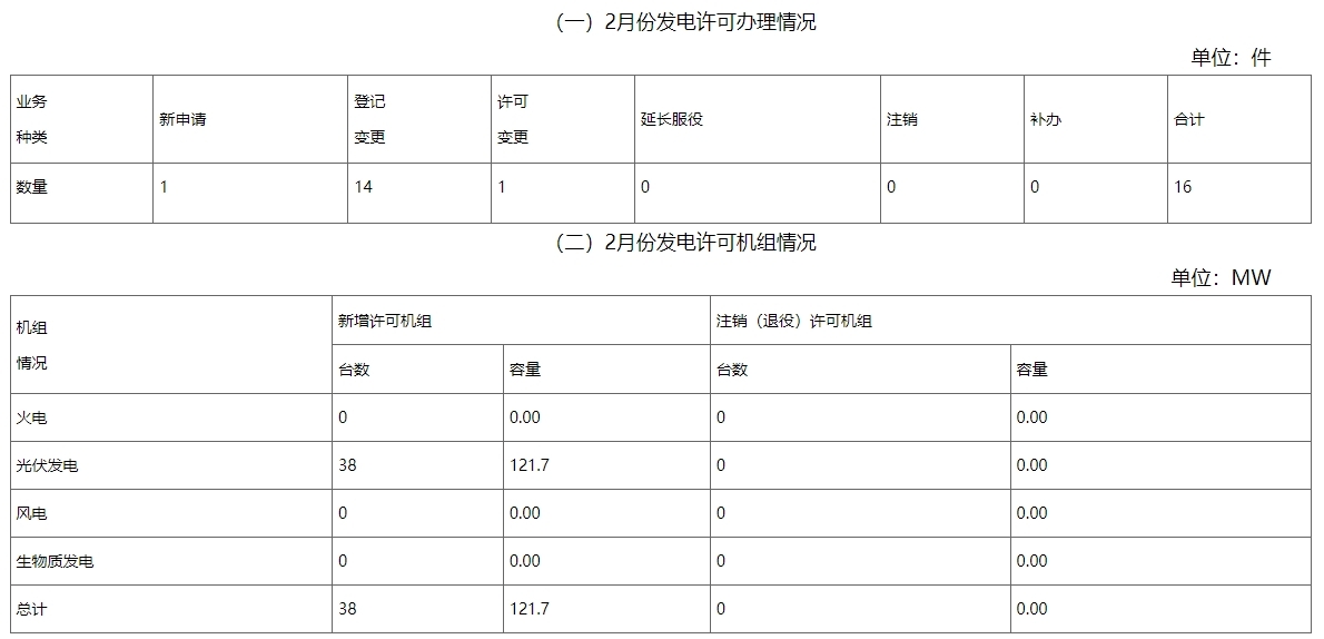 2月份,全省办理电力业务许可证(发电类)共计16件,其中新申请1件,许可事项变更1件,登记事项变更14件。新增许可机组38台(发电单元)总容量121.7兆瓦。