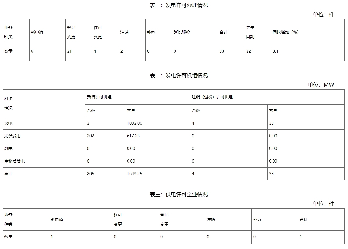截至2月29日,2024年共办理电力业务许可(发电类)业务33件,较去年同期增加3.1%,其中新申请6件,登记事项变更21件,许可事项变更4件,注销2件。新增发电装机205台(发电单元)总容量1649.25兆瓦,其中火电1032.00兆瓦,光伏发电617.25兆瓦。