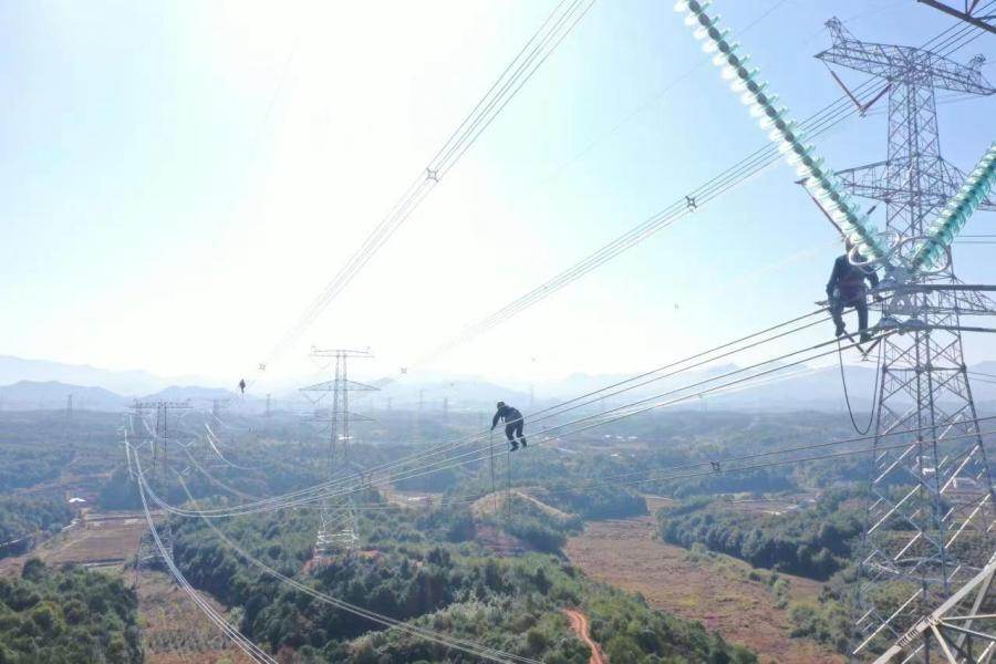 国网湖南电力员工在1000千伏南荆长特高压工程施工。