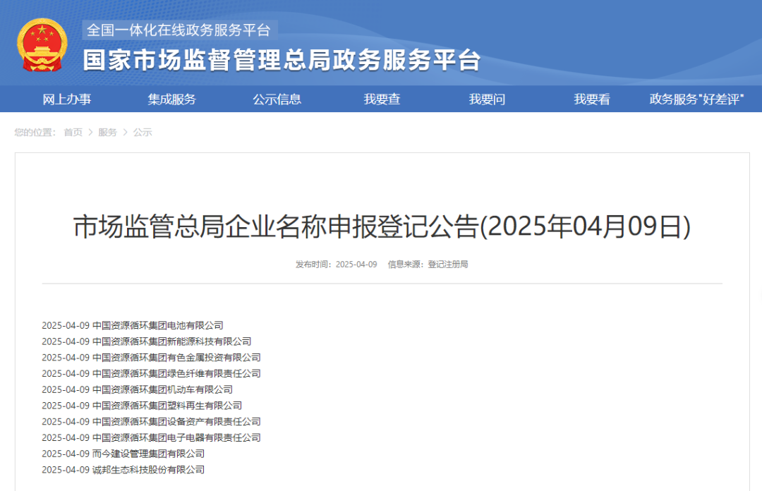 4月9日,国家市场监督管理总局企业名称申报登记公告显示,中国资源循环集团8家下属企业正式申报登记。