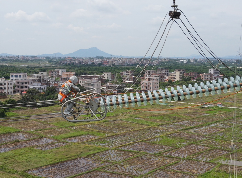 南方电网广东茂名供电局输电管理一所工作人员在台风来临前,对500千伏茂蝶乙线开展消缺作业。(臧楠 摄)