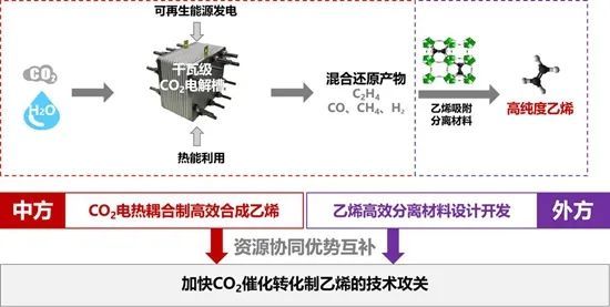 本案例依托国家重点研发计划“战略性科技创新合作”重点专项“电热耦合二氧化碳连续转化制高纯度乙烯关键技术研究”项目,汇集国内外创新资源,通过开发千瓦级二氧化碳转化电解槽与乙烯高效吸附分离材料,实现二氧化碳向高纯度乙烯的定向高值转化,为高碳排放行业探索出一条碳减排新路径。